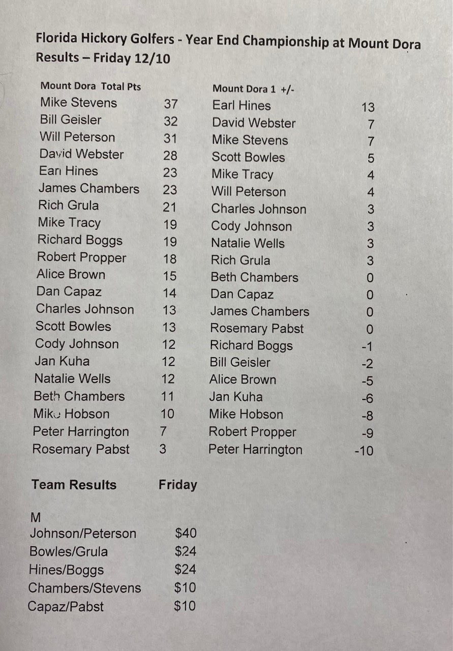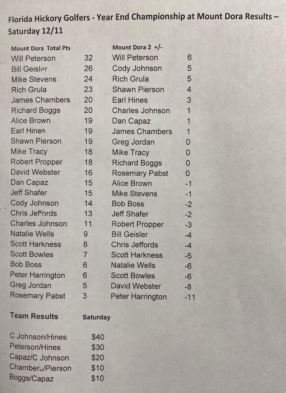 The Florida Hickory Golfers wrapped up 2020 with our annual championships at the Mount Dora Golf Club. The weather was outstanding and the course was in great shape. Congratulations to Will Peterson who has much of his game back after significant battle with health issues. Will’s 64 points edged out defending champion Mike Stevens by 2 points for the Stevens Trophy. On the Quota side, Earl Hines steady play resulted in Plus 16 overall and he takes home the Heritage Trophy.