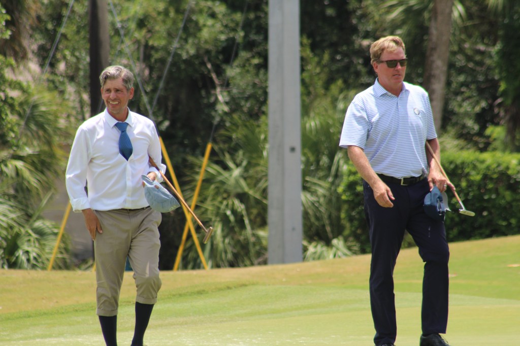 Florida Hickory Golfers acquitted themselves admirably at the Inaugural Florida State Hickory Open on May 24 and 25, by notching wins in three or four divisions. The event was held in the prestigious (and Donald Ross-designed) Sara Bay Country Club in Sarasota on May 24 and May 25. FHG winners included Will Peterson who clinched the Open championship with impressive scores of 72 / 79, besting FSGA President Kevin Hammer by just one stroke. The Winter Park duo of Rich Grula and Natalie Wells took top honors in the mens and ladies Stableford divisions, with Natalie capturing her victory by one stroke with a net eagle on the final hole. Rounding out the tournament winners was Bailey Wiegandt of Louisville, Ky., who won the Women’s Open division.