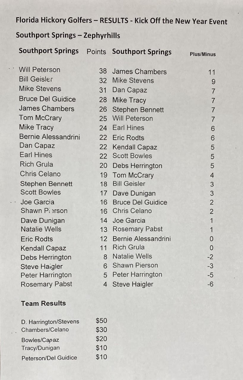 The Florida Hickory Golfers kicked off 2022 on January 2nd at Southport Springs Golf Club in Zephyrhills, managed by our own Earl Hines. It was a beautiful day on this fun track with lots of good golf. Will Peterson racked up 38 points and James Chambers was 11 points good to lead the way in quota differential. On the team side, Debs Harrington and Mike Stevens were plus 14 edging out James Chambers and Chris Celano by a single point.