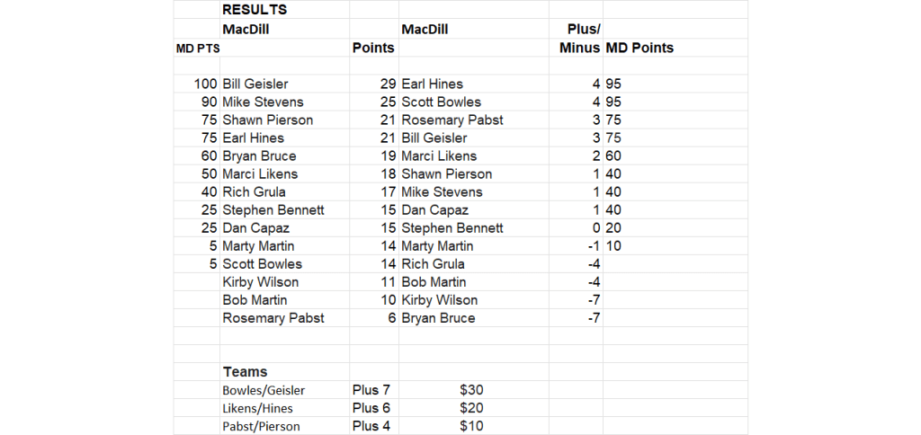 It was a beautiful day along the Bay at the South course on MacDill Air Force Base. The course was in excellent condition and Bill Geisler amassed 29 points to take the gross honors while Earl Hines and Scott Bowles lead the way in quota differential at plus 4 each. Bowles teamed up with Geisler in the blind draw and split the $30 first prize.
