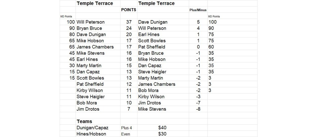 The official home of the Florida Hickory Golfers played its usual challenging self for most of us, although there were a couple of stellar performances. Will Peterson recorded 5 birdies in amounting 37 points and Dave Dunigan was 5 points better than his quota requirement. Dave also teamed with Dan Capaz to best everyone in the team blind draw earning $20 each.