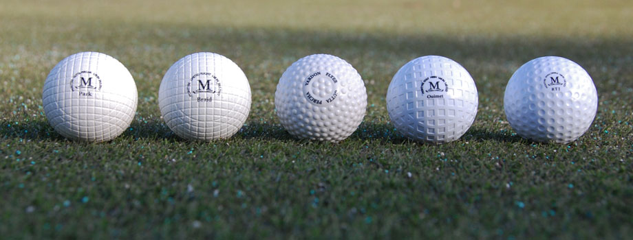 There is an endless discussion about hickory events only using sanctioned reproduction hickory balls, which are modern, low compression golf balls are heated and then stamped with a traditional pattern. The McIntyre Golf Company is about the only company producing such balls in any quantity. They offer a variety of surface patterns authentic to various eras of hickory golf. Their lineup is below.